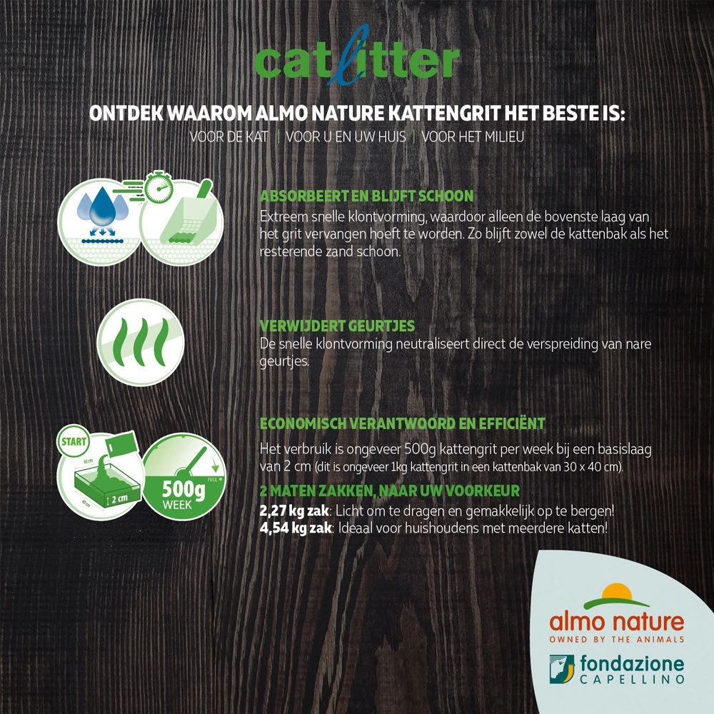 De kattenbakvulling van Almo Nature is kattengrit op een natuurlijke basis met plantaardige vezels. Deze vezels bevatten enzymen en zetmeel die ervoor zorgen dat er snel klonten geproduceerd worden, en dat de vieze geurtjes geneutraliseerd worden. Hierdoor heeft u geen rommel en blijft de kattenbak schoon. De klonten zorgen ervoor dat bij het reinigen alleen de bovenste laag verwijderd dient te worden. Tevens verdwijnen ook de risico’s op een verstopt kattentoilet, aangezien de klonten oplossen bij contact met water. Naast de bovenstaande voordelen zijn er ook nog economische voordelen aan deze kattenbakvulling. Het creëren van een basislaag kattengrind (2cm) kost maar de helft van de zakinhoud van Almo Nature. Zodra de basislaag is gemaakt, wordt het wekelijks verbruik geschat op ongeveer 500 gram.
