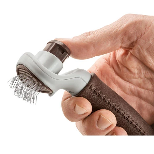 Vindt u het ook zo vervelend om de borstel van uw hond uit te pluizen na een grondige borstelbeurt? Daar heeft Hunter de Zelfreinigende Plukborstel op bedacht! Met één druk op de knop gooit u al de opgevangen haren weg, zo in de prullenbak. De borstel bestaat uit roestvrijstalen, stevige haren met afgeronde uiteindes. Zo kan de borstel geen krassen achterlaten op de huid. Het verwijdert alle klitten, knopen en losse haren gemakkelijk uit de vacht van uw hond.