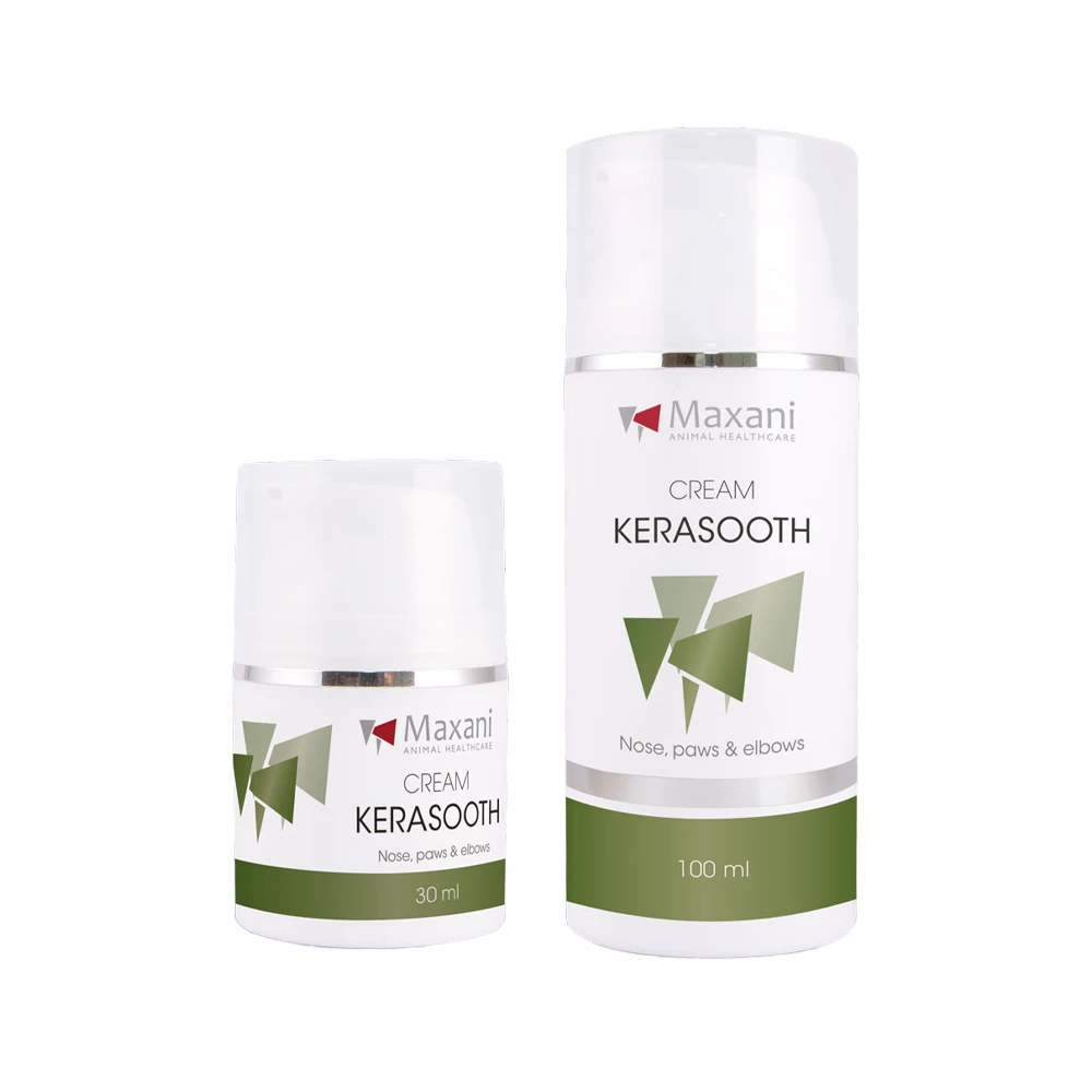 Heeft uw dier last van droge plekken of scheurtjes in de voetzoelen? Maxani KeraSooth crème verzacht de droge of ruwe voetzolen, neus en ellebogen.