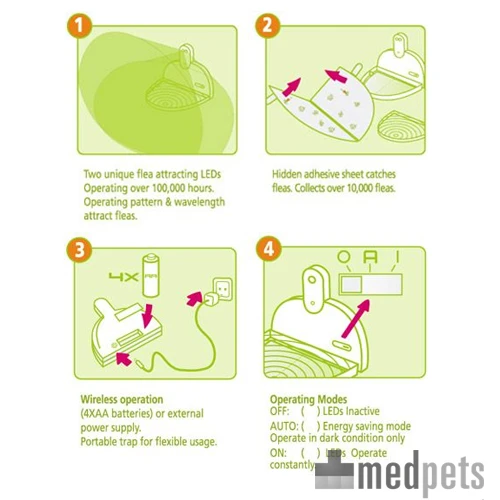 De myFleaTrap vlooienval werkt door middel van twee vlo aantrekkende LED lampen. Het lichtpatroon en de golflengte lokken de vlooien naar de myFleaTrap. Wanneer de vlooien op het kleefvel in de myFleaTrap terecht komen zitten de vlooien vastgeplakt. Ieder kleefvel kan gemiddeld 10.000 vlooien vangen. De kleefvellen hebben een gegarandeerde werking tot 6 weken na opening. Bij de myFleaTrap zijn 2 kleefvellen inbegrepen.